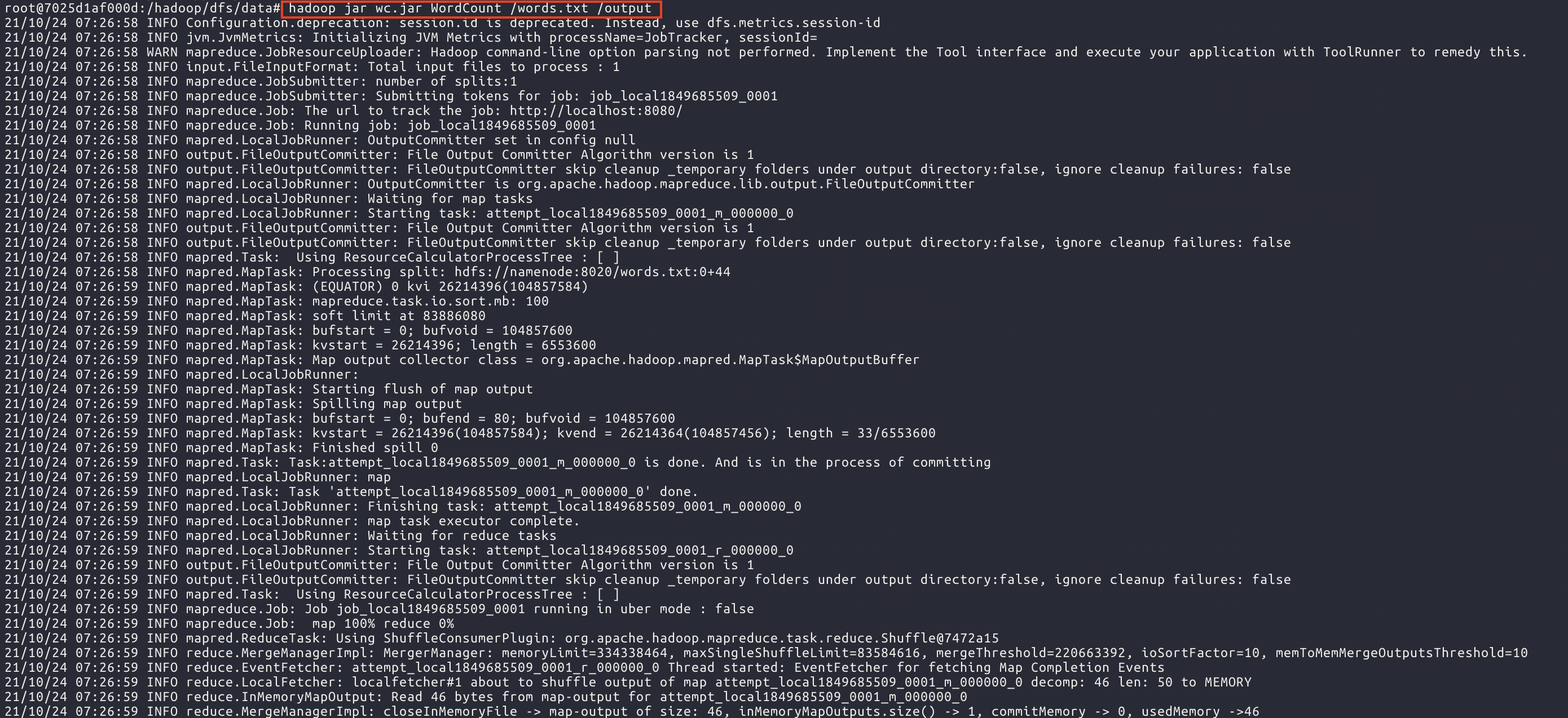 hadoop jar wc.jar WordCount /words.txt /output