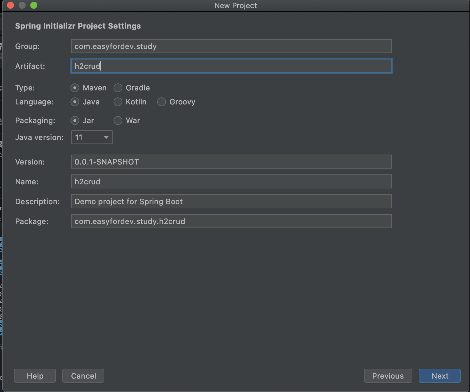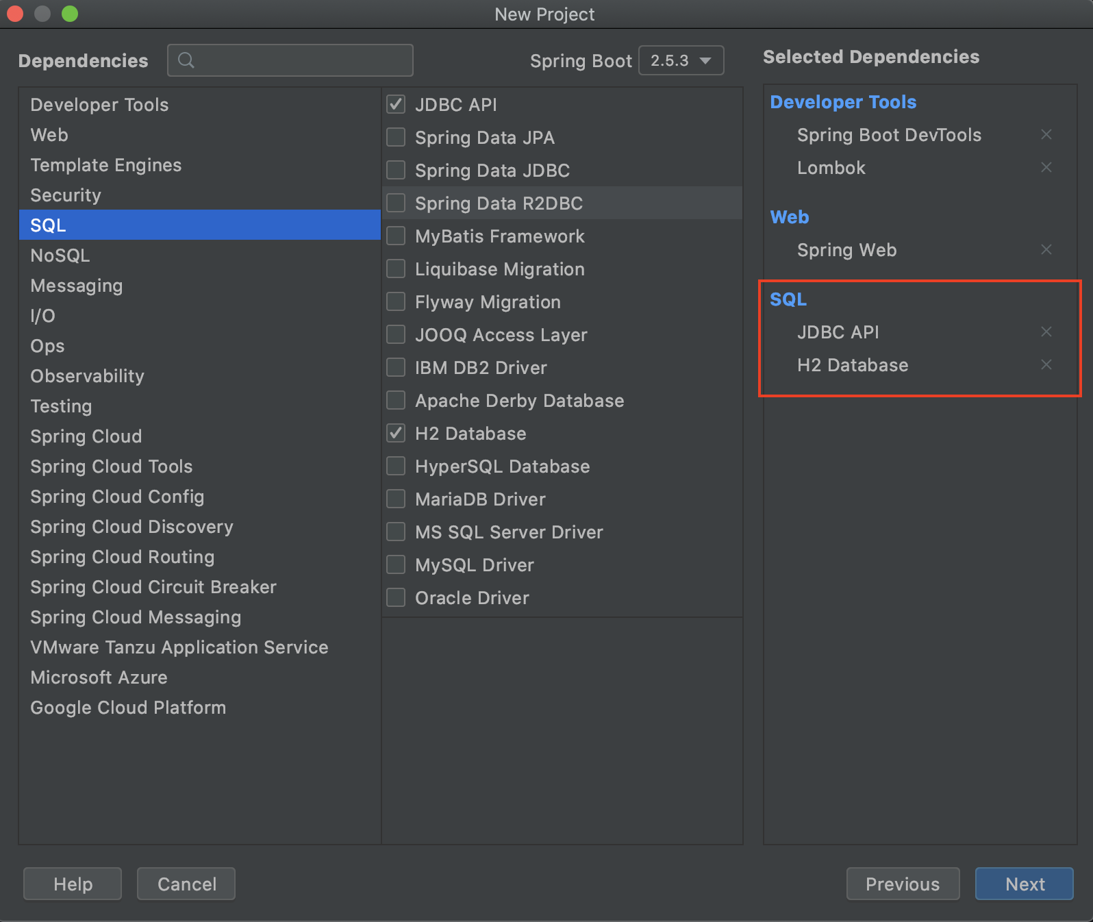 Dependency를 선택할 때 JDBC API, H2 Database를 반드시 선택해준다. 나머지는 자율