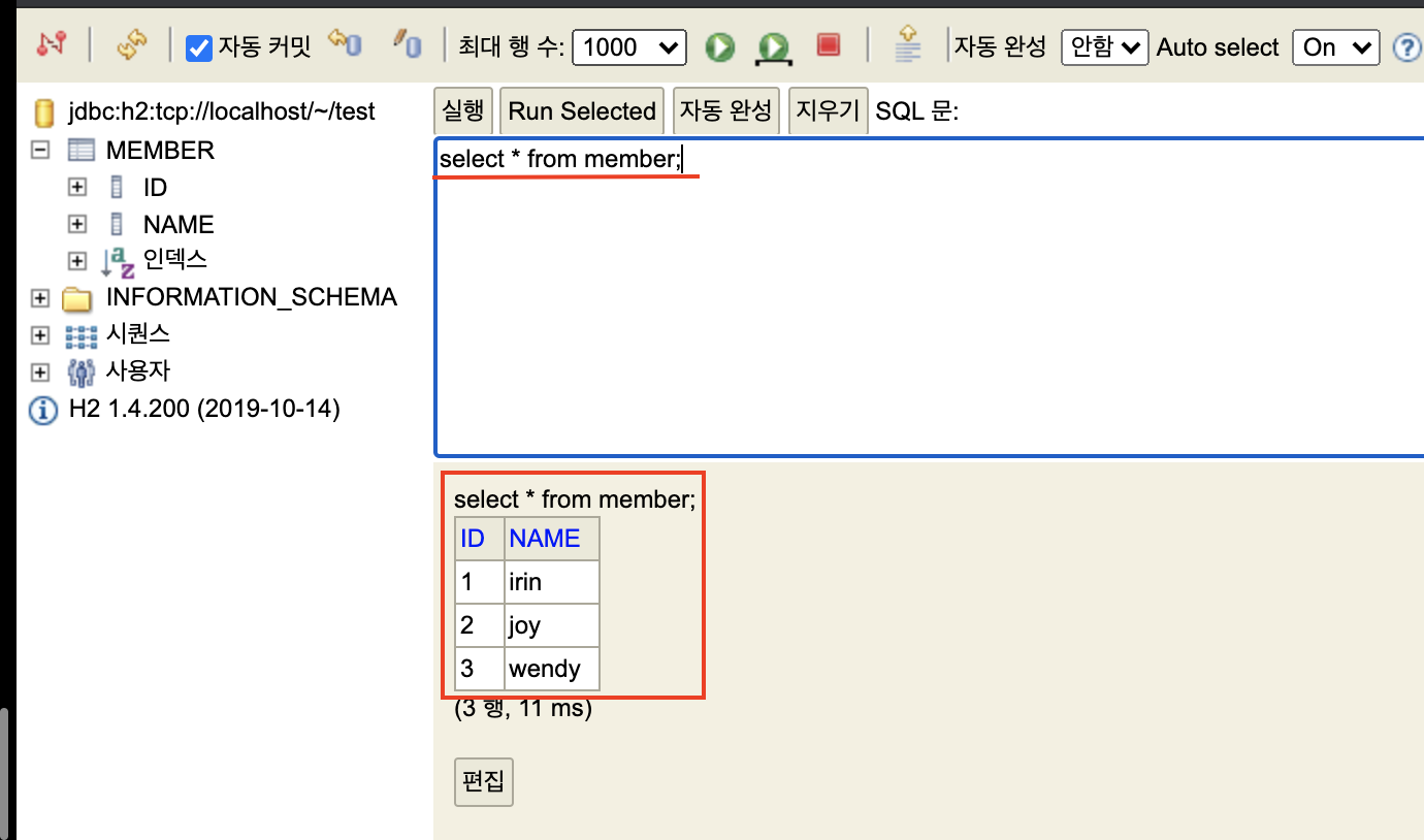 웹 H2 콘솔에서 간단한 쿼리를 날려서 확인해본다. 데이터가 잘 조회되면 커넥션 성공이다.